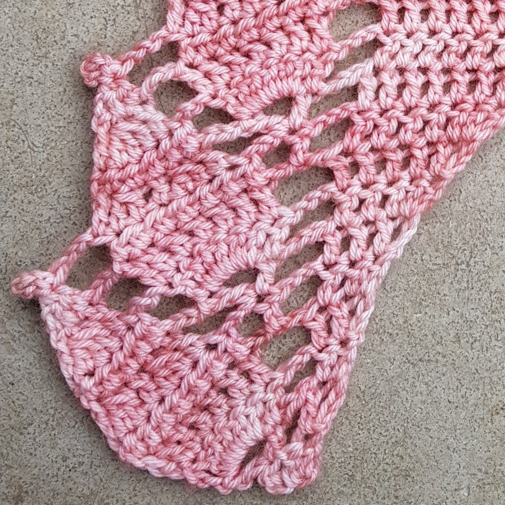 Row 26: Ch 3, 2 dc in first st, 20 dc, dc2tog, ch 3, skip ch-sp, [1 dc, ch 3, 1 dc] in next st, ch 3, skip ch-sp, *1 dc, dc2tog* x 2, 1 dc.