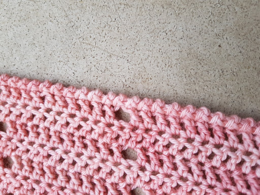From here on there will be an increase of 1-2 dc in every row, either in the beginning or the end of the row. There will also be a decrease of 1 dc in every other row by making a dc2tog.