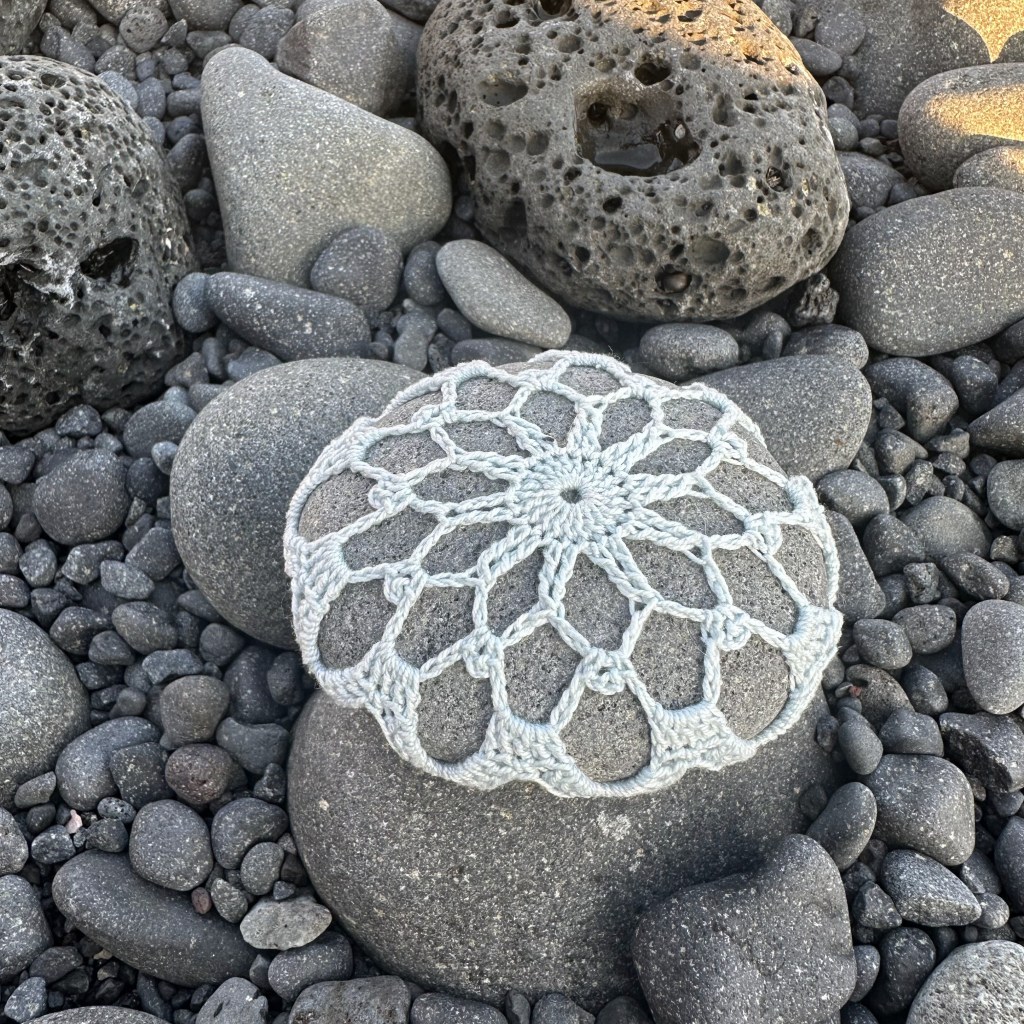 Gauge: Since no stones are the same, gauge doesn’t matter so much when crocheting around stones. I provide the crochet hook and yarn I use, as well as a simple measurement of the stone I used, so it can serve as a reference.
