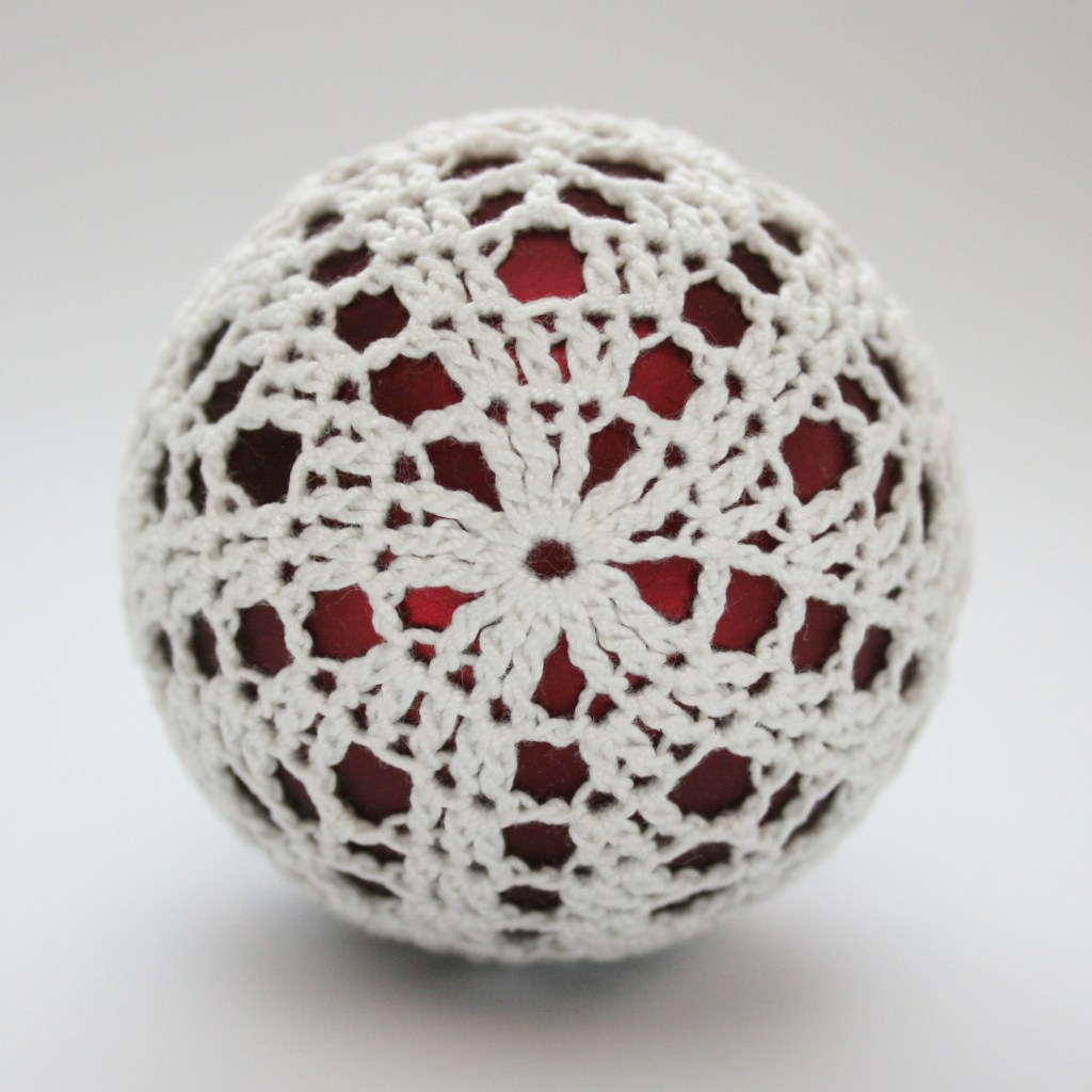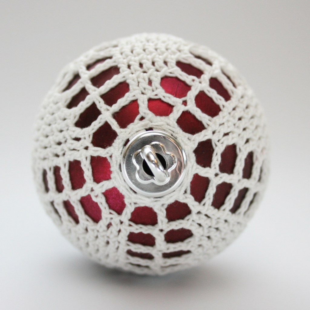 Note: The last rnds of the pattern are made with the ornament inside the crocheted cover piece. From now on you should try fitting the cover around the ornament to know when this must happen. If you wait too long you might have to do some unravelling to fit the ornament inside.