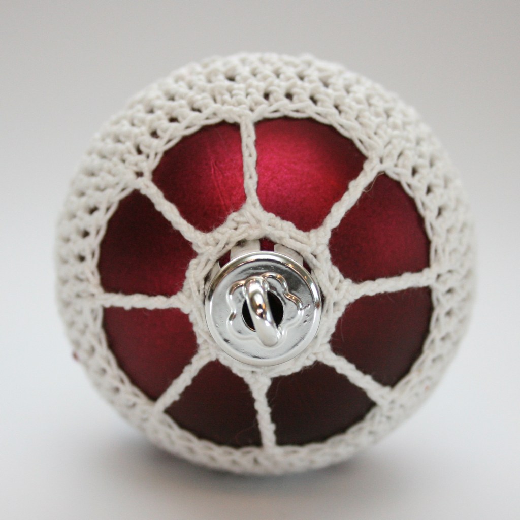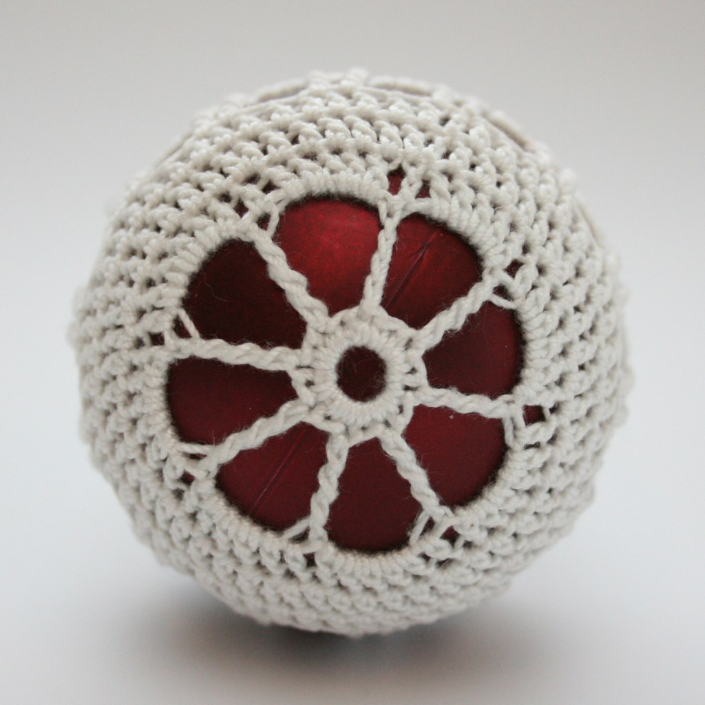 Note: At the end of rnd 10, before you join, you have to put the ornament inside the crocheted cover. Last round of the pattern is made with the cover around ornament